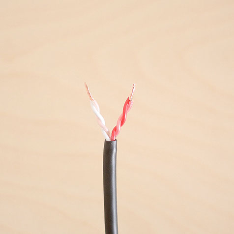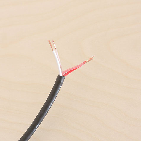 1台のスピーカーに繋ぐ場合は、上記「4芯スピーカーケーブルの加工方法」を参考に。ケーブルの文字のプリントされた2本の線を「+」、されていない2本の線を「ー」として、それぞれねじり合わせてご使用ください。